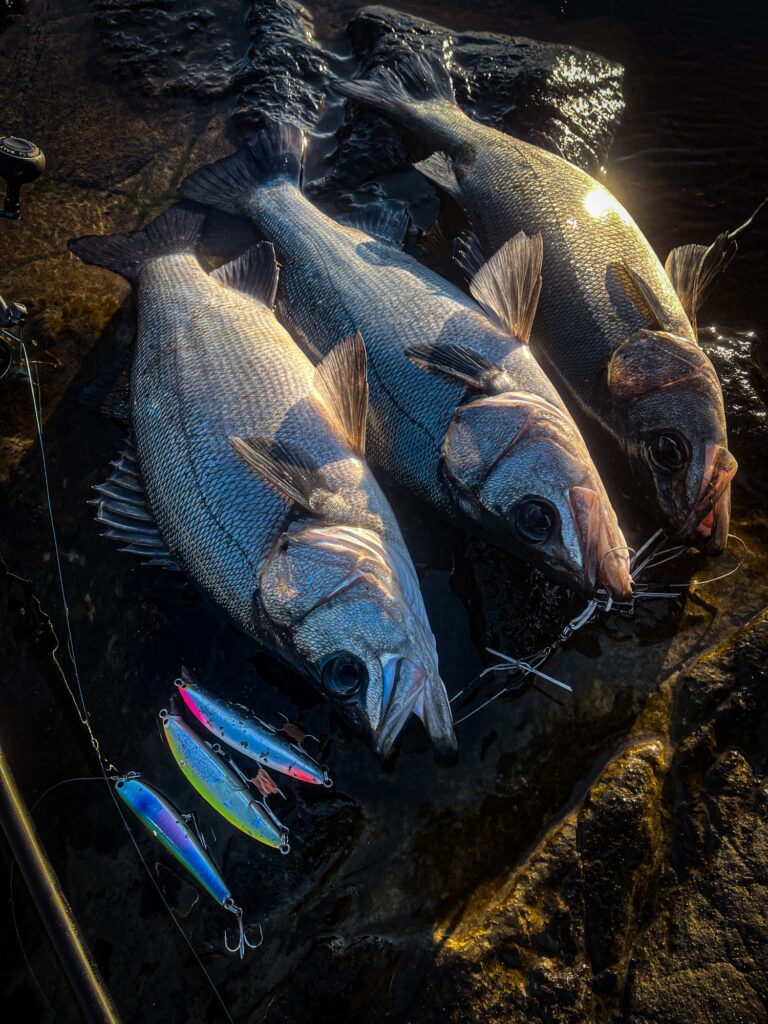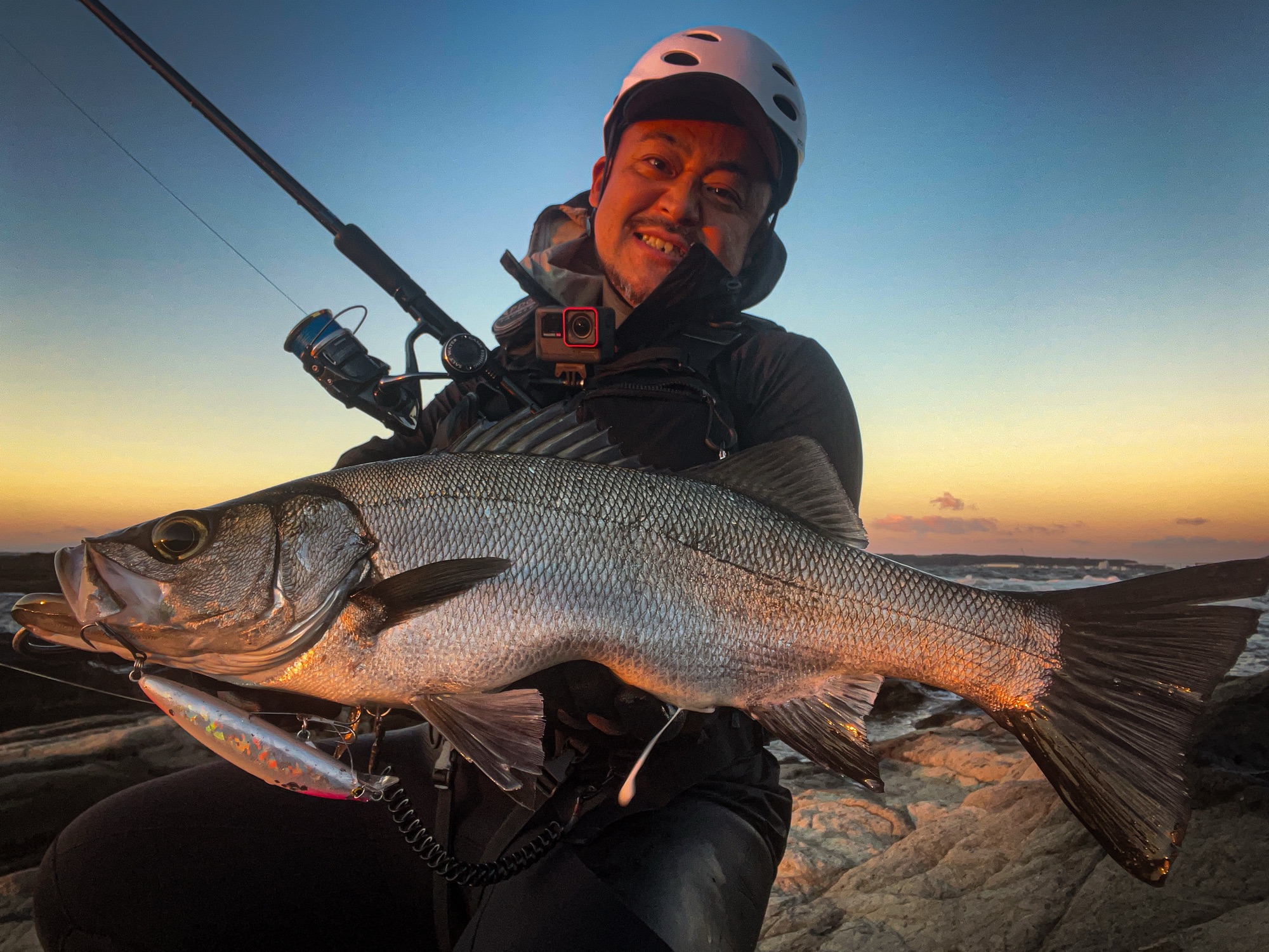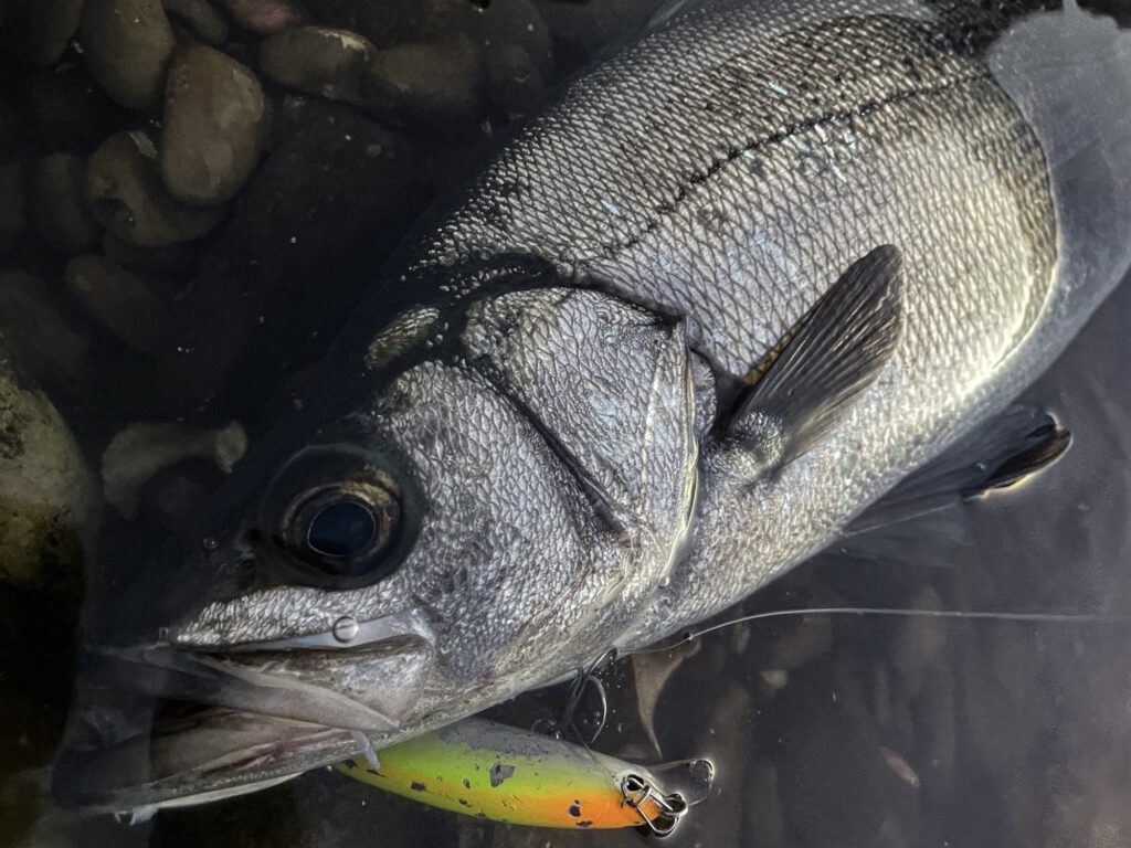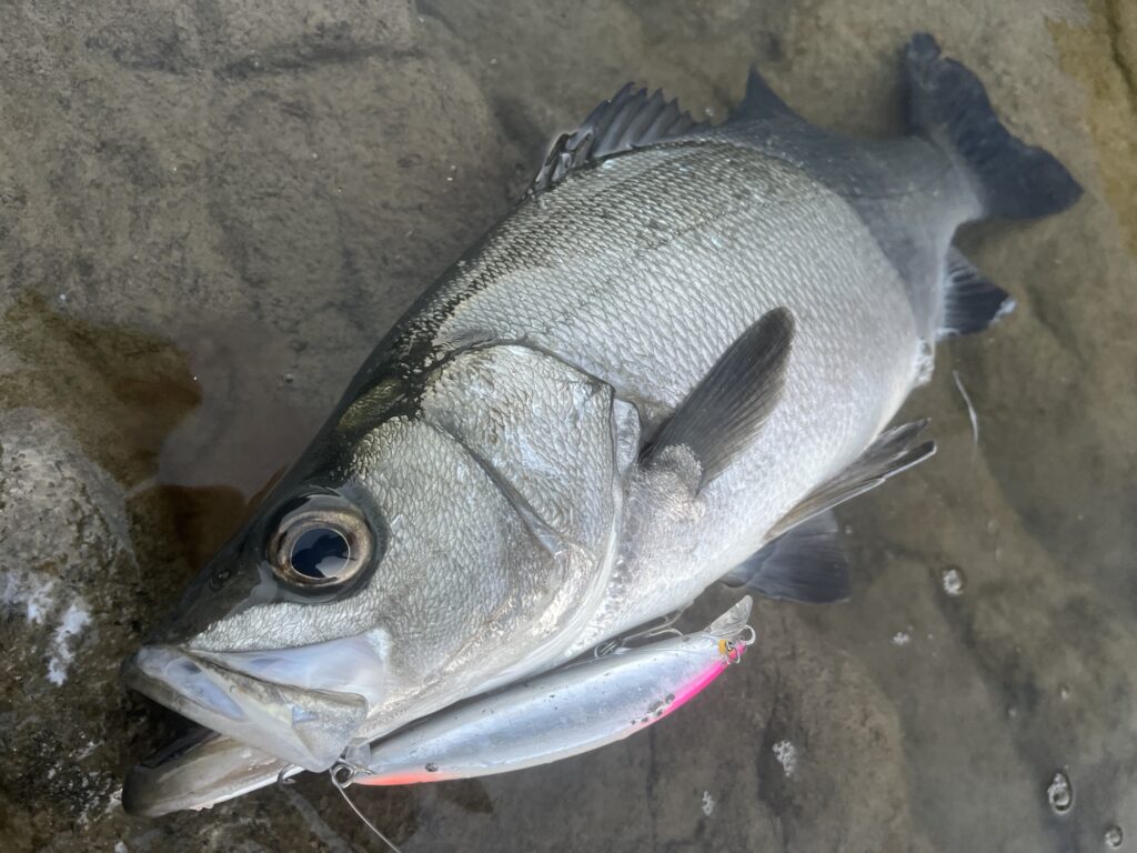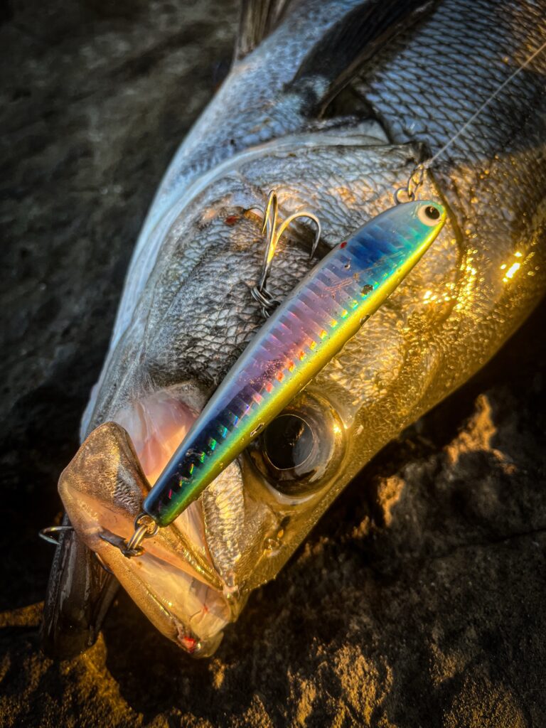 明らかなヒラスズキのバイト。問題はここからで、フッキングを入れテンションを維持しまま抜き上げる。何度もピックアップ寸前でフックアウトが続いていたので安堵感がたまらない。