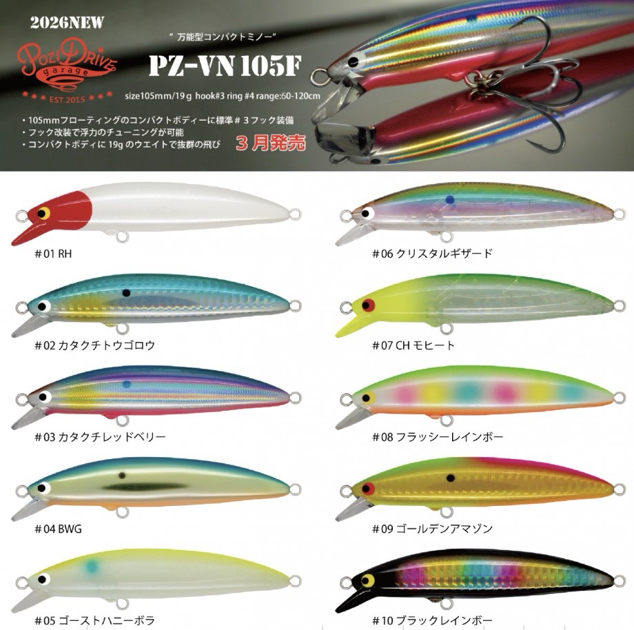 PZ-VN105Fは105mmの重さは19g、遠投性も効くフローティングミノー。レンジ60cm〜120cm