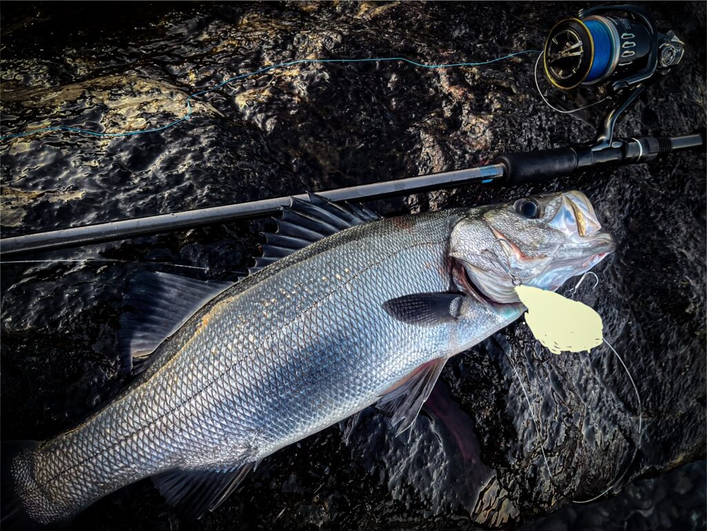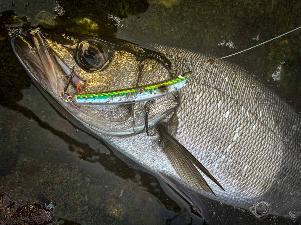 謎の秘密ルアーでヒラスズキをキャッチし、手前のスリットで重量感のあるバイトをいただく、、。